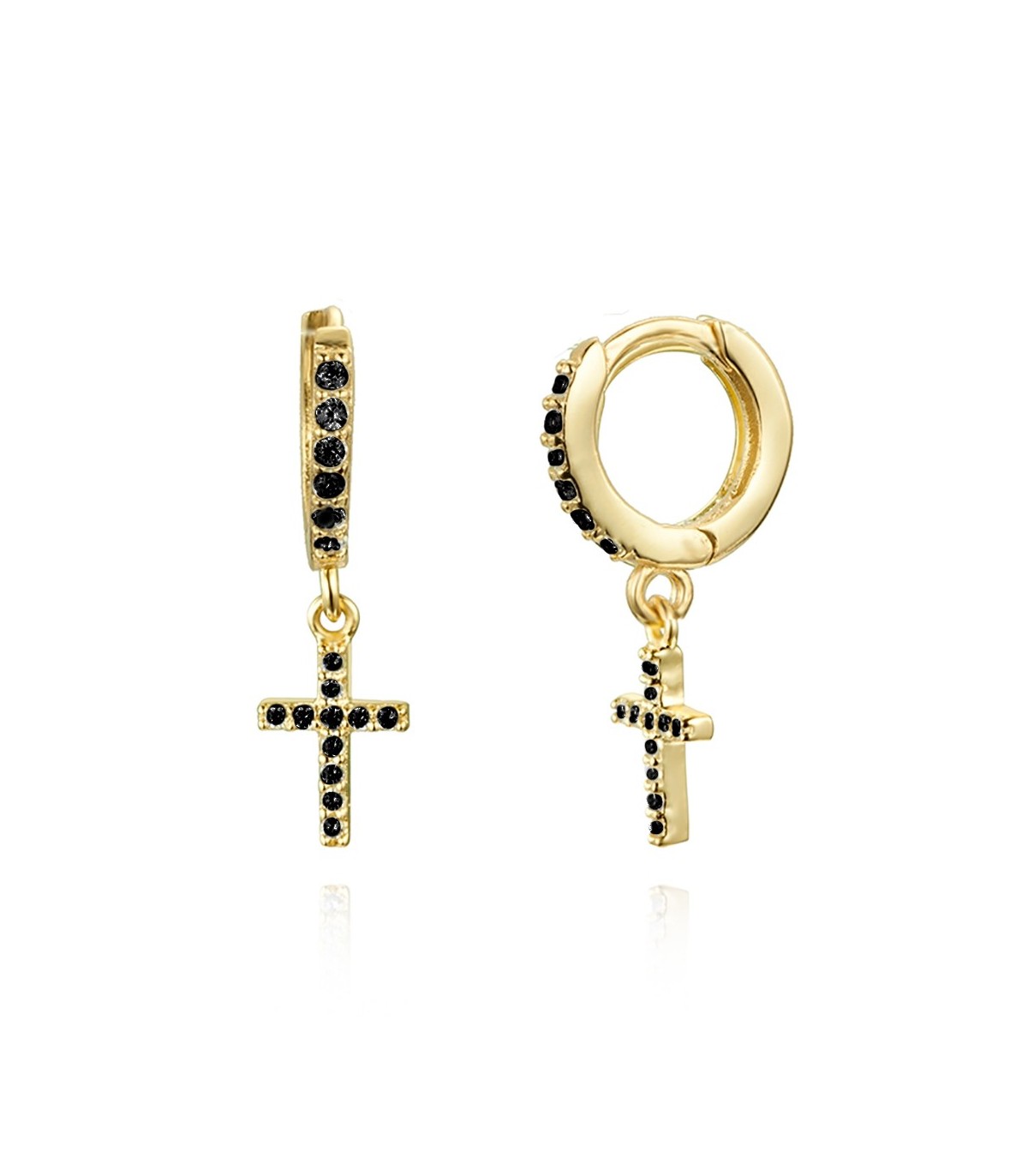 Aro con cruz y circonita negra en plata de ley 925 y chapado en oro.