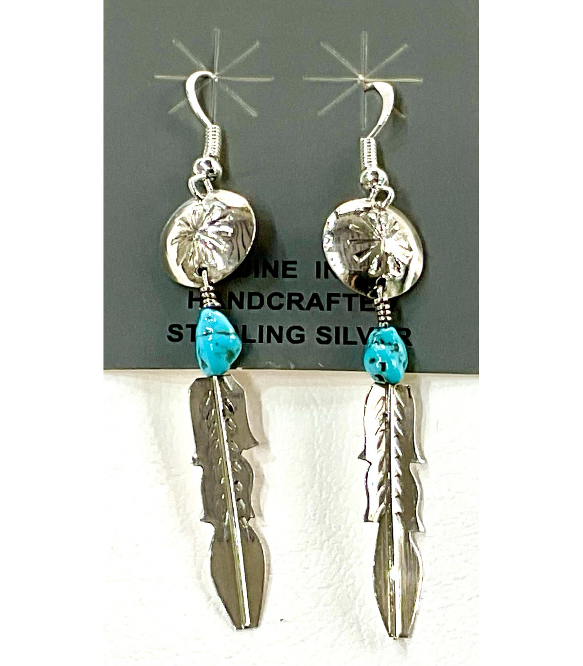 Pendientes en plata de ley 925 con turquesa de Arizona sleepy beauty de los indios americanos Zunis. Medidas largo 6 cm.