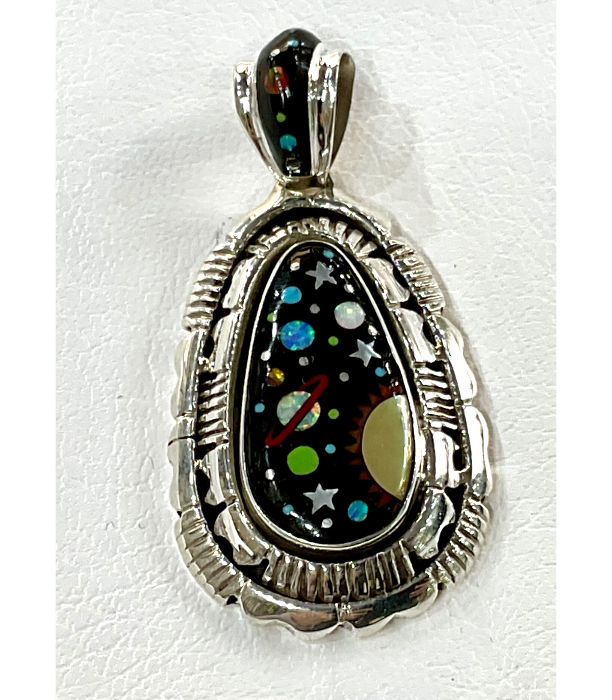 Colgante en plata de ley 925 de los nativos indios americanos de USA. Lleva minerales de los cuales son los siguientes: ónix,ópalo blanco,coral,lápiz lazuli,turquesa sleepy beauty de Arizona y nácar. Piezas hechas a mano y únicas de l,a tribu Zúni.