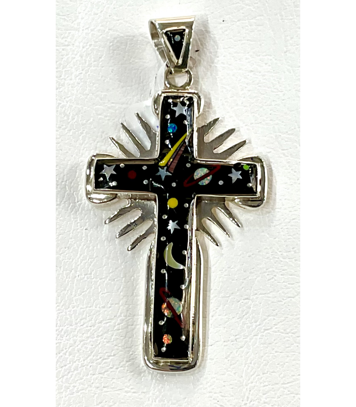 Colgante en plata de ley 925 en forma de cruz de los indios nativos americanos de USA. Lleva minerales como el ónix,ópalo blanco,nácar,coral y concha. Medidas largo x ancho: 6,2 cm x 3,5 cm.