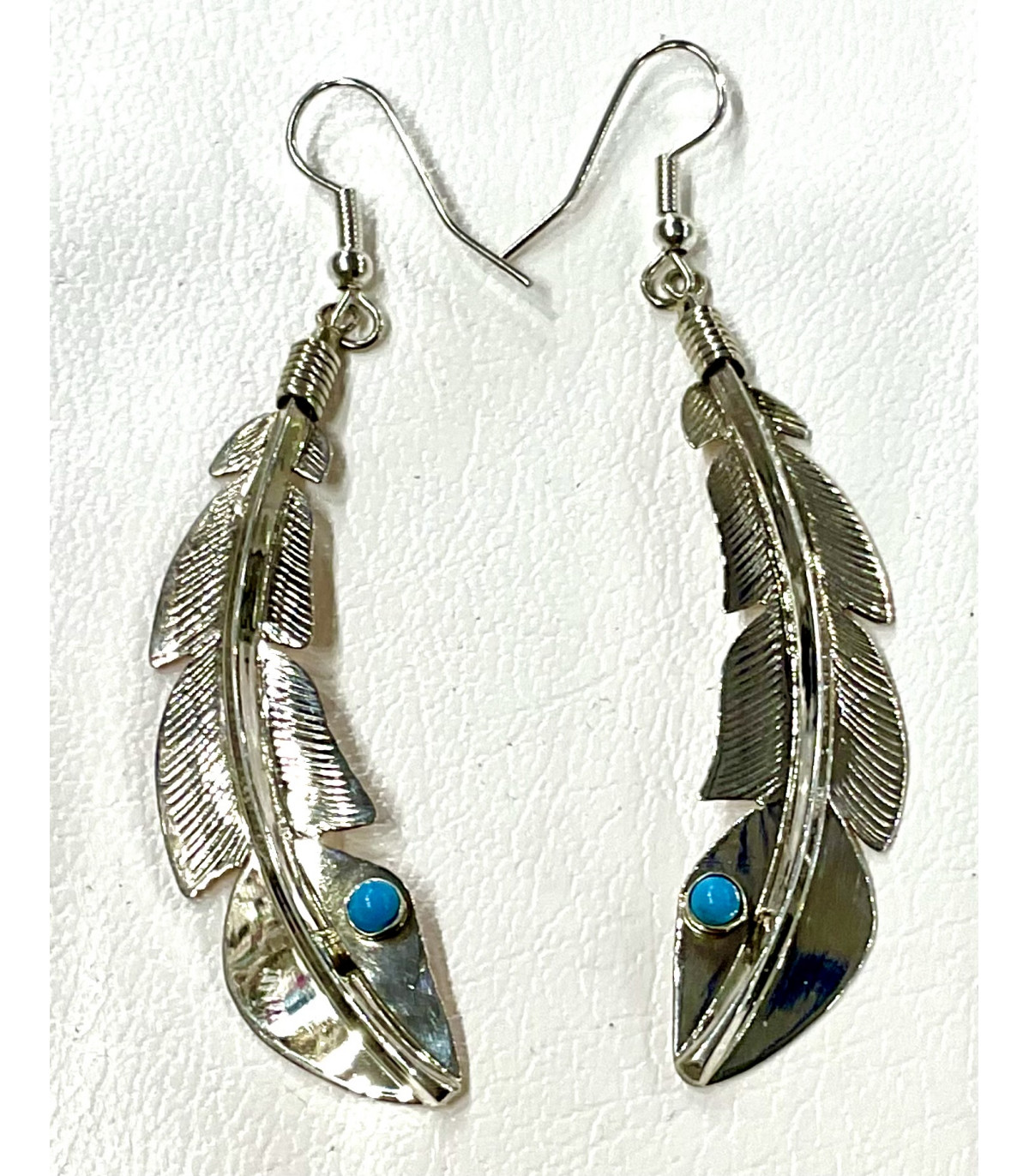 Pendientes en plata de ley 925, con turquesa, hechos a mano por la tribu de los indios nativos americanos Zuni. Medidas largo 7,5 cm.