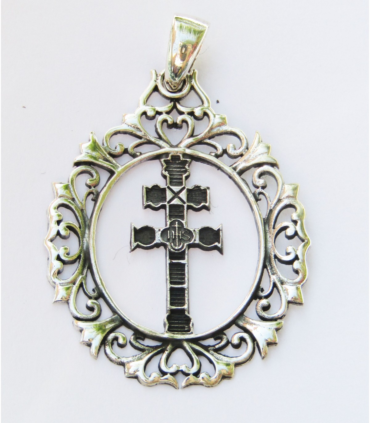 Colgante en plata de ley 925 en forma de cruz de caravaca dentro de una forma ovalada.