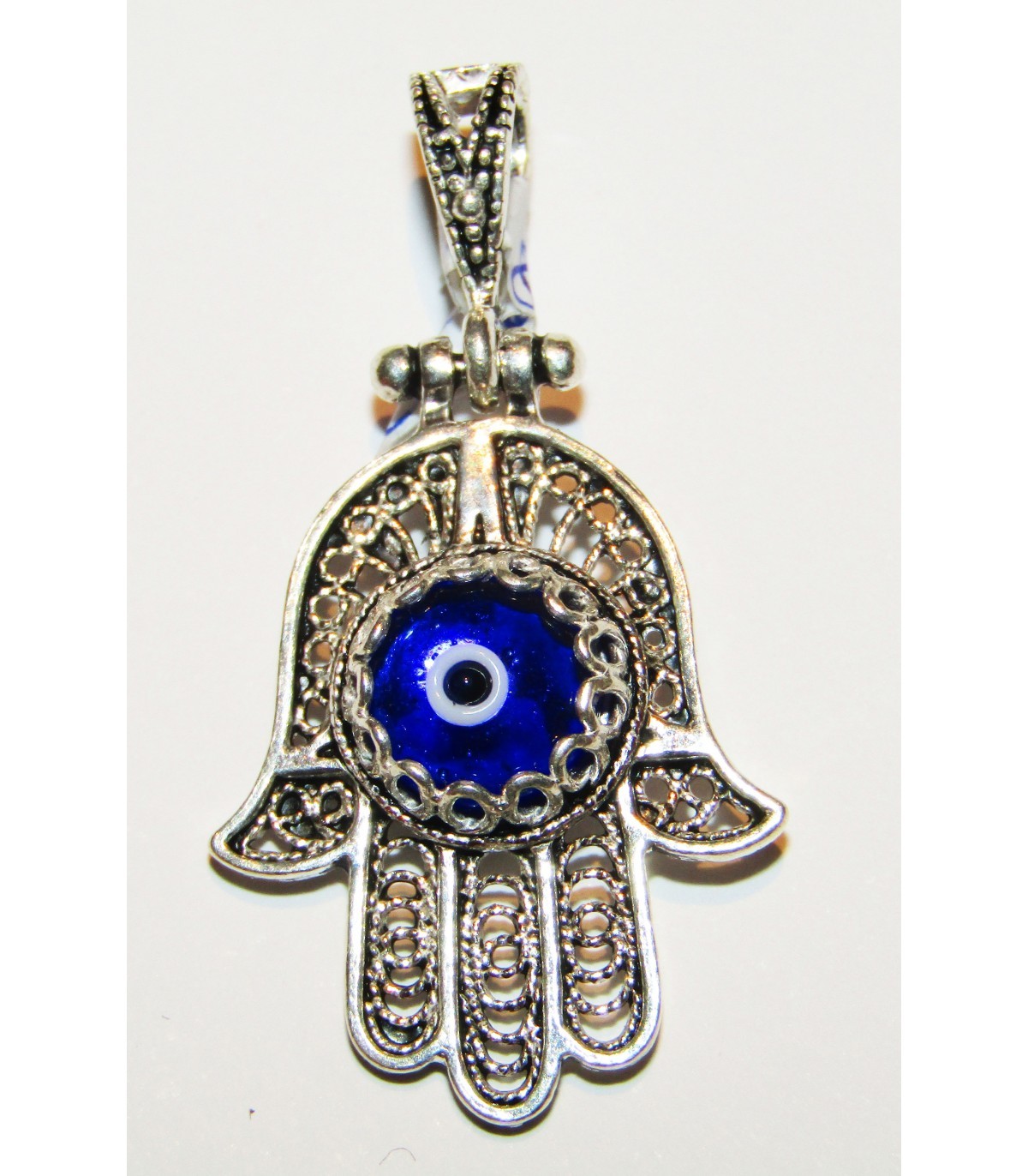 Colgante en plata de ley 925,en forma de mano de fatima y ojo en cristal de murano.